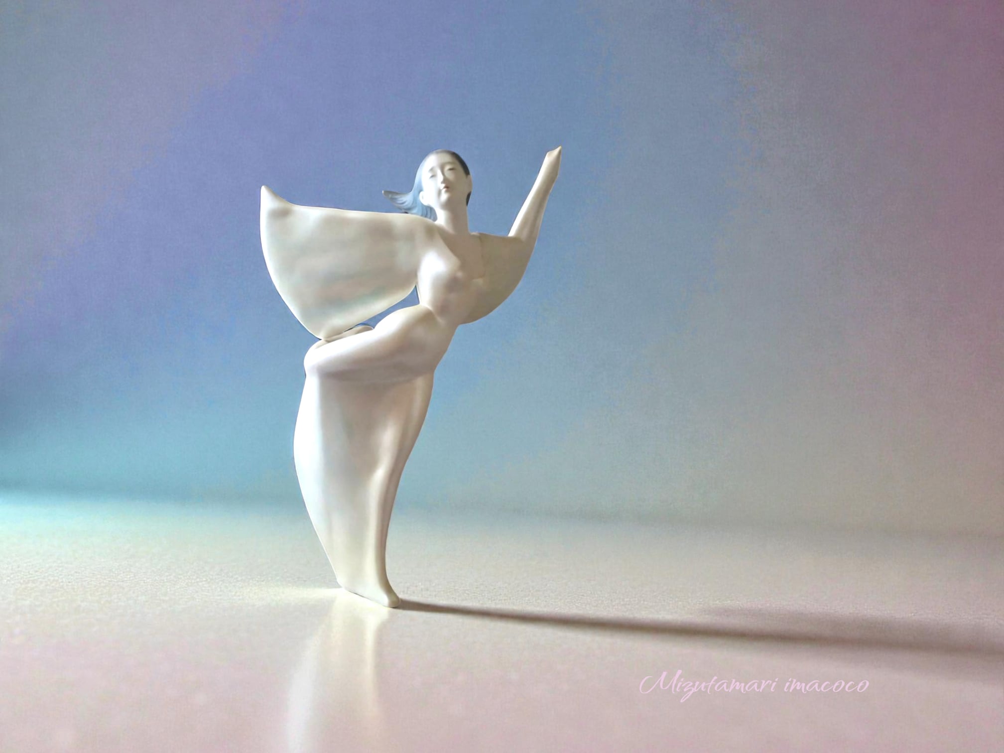 アトリエ「Mizutamari 」にて制作されたテラコッタアート造形作品に(粘土を焼き上げたテラコッタの素朴な肌に、繊細な彩色を施すスタイルが特徴)物語と背景を添えたデジタル画像。